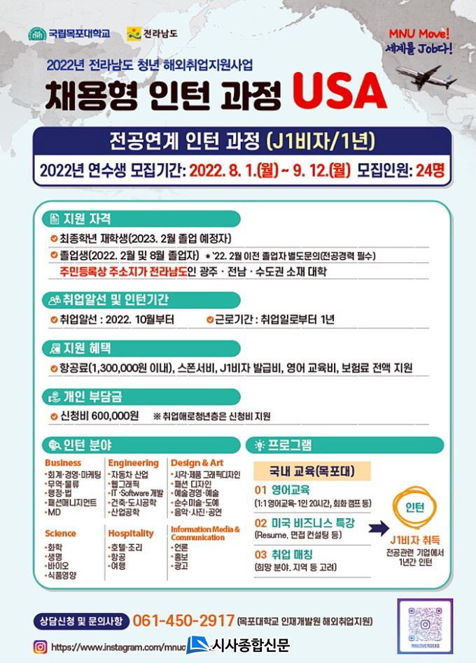 ÇÑÆí, 2020³â°ú 2021³â ¿î¿µÇÑ ¡®Àü¶ó³²µµ û³â ÇØ¿ÜÃë¾÷ Áö¿ø»ç¾÷¡¯ ä¿ëÇü ÀÎÅÏ(¹Ì±¹)°úÁ¤ÀÇ ¿¬¼ö»ý 48¸í(¸ñÆ÷´ë 33¸í, È£³²´ë 8¸í, Á¶¼±´ë 3¸í, Àü³²´ë 1¸í, ¼øÃµ´ë 1¸í, µ¿½Å´ë 1¸í, ¼÷¸í¿©´ë 1¸í) Àü¿øÀÌ ¹°·ùȸ»ç(CJ, FNS, Ocean Blue Express, Nippon Express µî), ÈÀåǰ¿¬±¸¼Ò(Cosmax µî), À¯Åëȸ»ç(H-Mart µî), °ÇÃàȸ»ç(Sea Pac), È£ÅÚ(Double Tree Hotel), ¹æ¼Û±¹(KBN TV), ±ÝÀ¶±â°ü(Woori America Bank), ¿©Çà»ç(Prune World) µî 30¿© °³ ¹Ì±¹¿¡ ÀÖ´Â ±â¾÷À¸·Î Ãë¾÷¿¡ ¼º°øÇß´Ù.