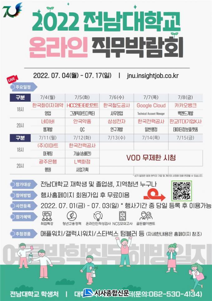 ´Ù¾çÇÑ ÇÁ·Î±×·¥°ú °æÇ° À̺¥Æ®°¡ º´ÇàµÇ´Â ¿Â¶óÀÎ Á÷¹«¹Ú¶÷ȸ¿¡ Âü¿©¸¦ Èñ¸ÁÇÏ´Â Áö¿ªÃ»³â ¹× ÀçÇлýÀº ¡º2022³âµµ Àü³²´ëÇб³ ¿Â¶óÀÎ Á÷¹«¹Ú¶÷ȸ Àü¿ë ȨÆäÀÌÁö(https://jnu.insightjob.co.kr)¸¦ ÅëÇØ ´©±¸³ª Âü¿© °¡´ÉÇϸç, ÇöÁ÷ÀÚ¿¡°Ô ±Ã±ÝÇÑ Áú¹®»çÇ×À» ¹Ì¸® »çÀü¿¡ µî·ÏÇÒ ¼öµµ ÀÖ´Ù.