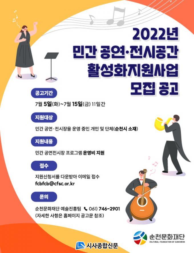 | ¼øÃµ¹®ÈÀç´Ü, ¹Î°£ °ø¿¬¡¤Àü½Ã Ȱ¼ºÈ Áö¿ø Àü½Ã¡¤°ø¿¬ ¿î¿µ ¹®È½Ã¼³¿¡ ÃÖ´ë 500¸¸¿ø Áö¿ø, 7¿ù 15ÀϱîÁö ½ÅûÁ¢¼ö |