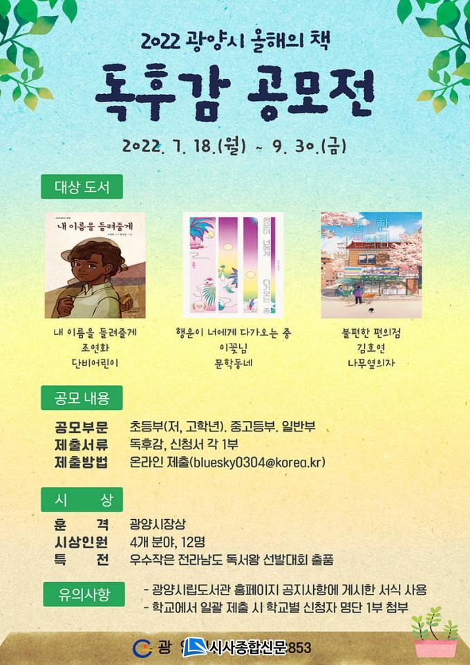 µ¶Èݨ °ø¸ðÀüÀº ÃʵîºÎ, Áß¡¤°íµîºÎ, ÀϹݺΠ¼¼ ºÎ¹®À¸·Î ³ª´µ¸ç ±¤¾ç½Ã¹ÎÀÌ¸é ´©±¸µçÁö Âü¿©ÇÒ ¼ö ÀÖ´Ù. ´ë»óµµ¼´Â 2022³â ±¤¾ç½Ã ¿ÃÇØÀÇ Ã¥À¸·Î, ±×Áß ÇÑ ±ÇÀ» ¼±Á¤ÇØ µ¶ÈݨÀ» Á¦ÃâÇÏ¸é µÈ´Ù.
