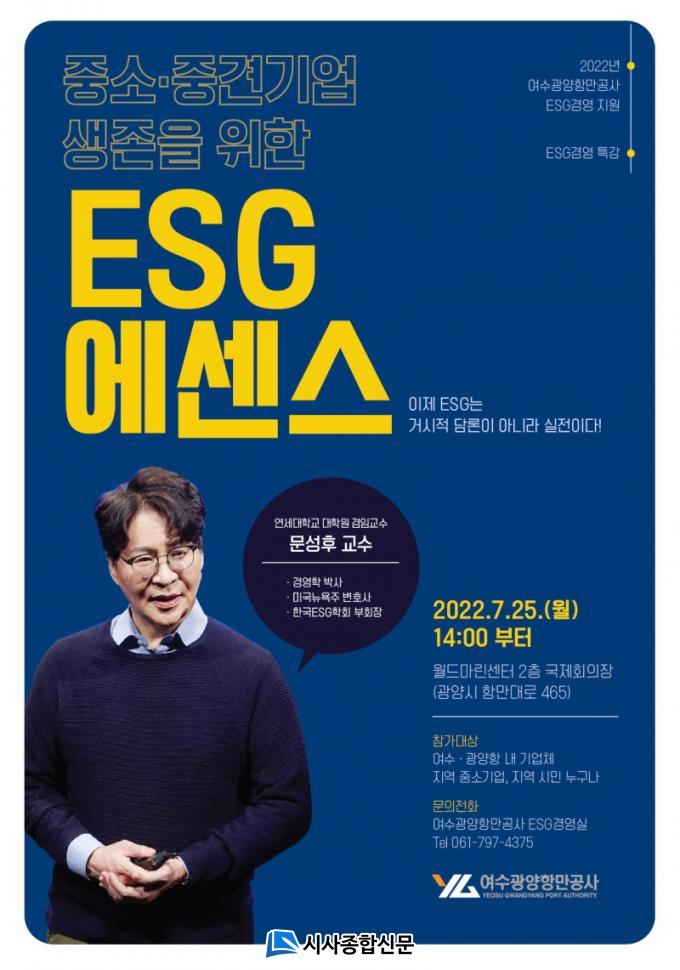 [½Ã»çÁ¾ÇսŹ® = Àå¹Î±Ô ±âÀÚ] ¿©¼ö±¤¾çÇ׸¸°ø»ç(»çÀå ¹Ú¼ºÇö, YGPA)´Â Áö¿ª Áß¼Ò±â¾÷°ú ¿©¼ö¡¤±¤¾çÇ× Çù·Â¾÷ü, Áö¿ª¹Î µîÀ» ´ë»óÀ¸·Î Àü¹®°¡ ÃÊû ESG °æ¿µ Ưº°°¿¬È¸¸¦ °³ÃÖÇÑ´Ù°í 15ÀÏ ¹àÇû´Ù.
