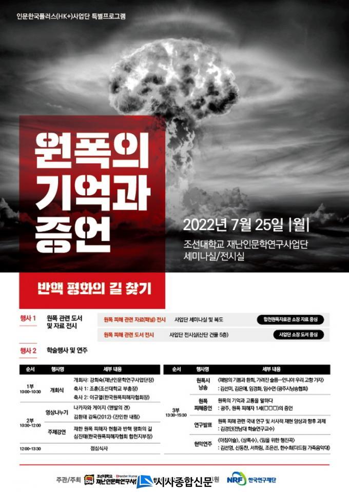 ¿À´Â 25ÀÏ ¿ÀÀü 10½ÃºÎÅÍ ¿ÀÈÄ 3½Ã 30ºÐ±îÁö Á¶¼±´ëÇб³ º»°ü 4Ãþ »ç¾÷´Ü ¼¼¹Ì³ª½Ç°ú Àü½Ã½Ç¿¡¼ ÁøÇàµÇ´Â À̹ø Ưº°Çà»ç´Â ¿øÆø ÇÇÇØ Àç³À» ±â¾ïÇϰí Áõ¾ðÇÏ´Â ÀÚ¸®·Î ¸¶·ÃµÆÀ¸¸ç ±Ã±ØÀûÀ¸·Î´Â ¹ÝÇÙ ÆòÈÀÇ ±æÀ» ¸ð»öÇϰíÀÚ ±âȹµÆ´Ù. ¸Å³â 8¿ù 6ÀÏÀ̸é Çѱ¹ÀÇ È÷·Î½Ã¸¶·Î ºÒ¸®´Â °æ³² ÇÕõ¿¡¼ ¿øÆø Èñ»ýÀÚ Ãßµµ½ÄÀÌ ¿¸®°í ÀÖ¾î À̸¦ À§ÇÑ ÀÏÁ¾ÀÇ Àü¾ßÁ¦ÀÎ ¼ÀÀÌ´Ù.