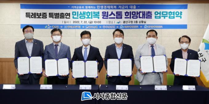 ±¤»ê±¸´Â 22ÀÏ ¿ÀÀü ±¸Ã» 2Ãþ »óȲ½Ç¿¡¼ ±¤Áֽſ뺸ÁõÀç´Ü, ±¤ÁÖÀºÇà, ¼±¤ÁÖ»õ¸¶À»±Ý°í, ÇѸ¶À½»õ¸¶À»±Ý°í, ¿ì»ê½ÅÇù°ú ¡®2022³â ¼Ò»ó°øÀΠƯ·Êº¸Áõ ´ëÃâ ¾÷¹«Çù¾à(MOU)¡¯À» ü°áÇß´Ù. À̸¦ ÅëÇØ Äڷγª19 °æÁ¦À§±â·Î Ÿ°ÝÀ» ÀÔ¾ú°Å³ª °æ¿µÀÌ ¾ÇȵŠ´ãº¸ ´É·ÂÀÌ ºÎÁ·ÇÑ ¼Ò»ó°øÀÎ, ÀÚ¿µ¾÷ÀÚ¿¡°Ô Àú±Ý¸®·Î ÀÚ±ÝÀ» ºô·ÁÁÖ´Â ¡®¹Î»ýȸº¹ ¿ø½ºÅé Èñ¸Á´ëÃ⡯ Áö¿ø¿¡ ³ª¼±´Ù. ´ëÃâ ±Ô¸ð´Â »ç»ó ÃÖ´ëÀÎ ÃÑ 51¾ï6000¸¸ ¿ø(Ã⿬±Ý 4¾ï3000¸¸ ¿øÀÇ 12¹è)ÀÌ´Ù.