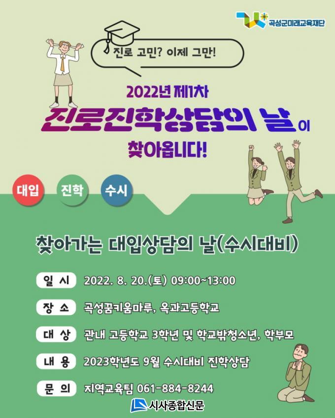 Á¦1Â÷ ÁøÇлó´ãÀº ¡®Ã£¾Æ°¡´Â ´ëÀÔ»ó´ãÀÇ ³¯(¼ö½Ã´ëºñ)¡¯·Î 2023Çг⵵ 9¿ù ¼ö½Ã¿ø¼ Á¢¼ö ´ëºñ¸¦ À§ÇØ °î¼º °ü³» °íµîÇб³ 3ÇÐ³â ¹× Çб³ ¹Û û¼Ò³â, Çкθ𸦠´ë»óÀ¸·Î 9:00 ~ 13:00±îÁö ÁøÇàµÇ¸ç, »ó´ã½ÅûÀº °¢ ÇØ´ç °íµîÇб³¿Í °î¼º±ºÇб³¹Ûû¼Ò³âÁö¿ø¼¾ÅÍ¿¡¼ 7¿ù 27ÀϱîÁö ½ÅûÀ» ¹Þ´Â´Ù.