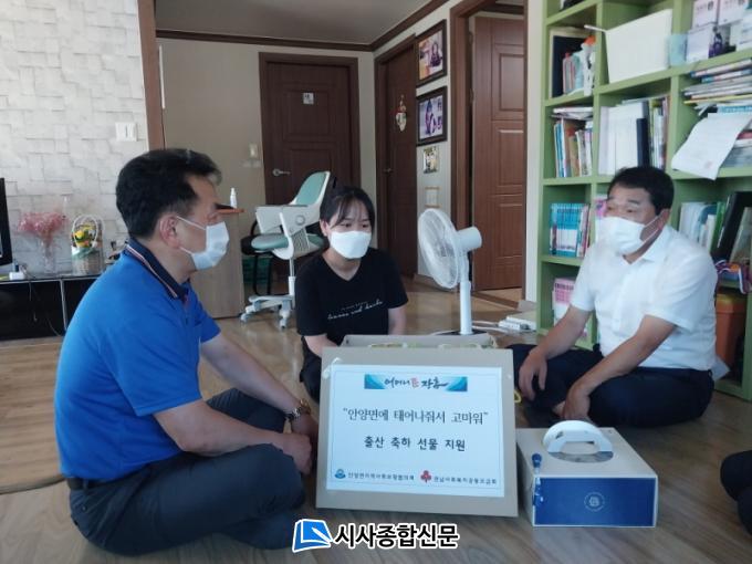 [½Ã»çÁ¾ÇսŹ® = ¿À½ÂÅà ±âÀÚ] ÀåÈﱺ ¾È¾ç¸é Áö¿ª»çȸº¸ÀåÇùÀÇü(À§¿øÀå À±¾çÇö¡¤±è¿µÁß)¿¡¼´Â 26ÀÏ Ãâ»êÀÇ ±â»ÝÀ» ÇÔ²² ³ª´©±â À§ÇØ Ãâ»ê°¡Á¤À» ¹æ¹®ÇØ ÃàÇÏ ¼±¹°(±âÀú±Í, ¹°Æ¼½´ µî)À» Àü´ÞÇß´Ù.