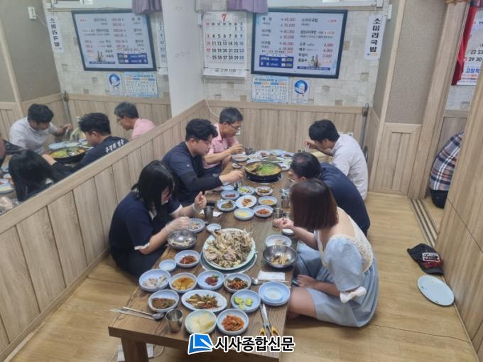 ÀÌ¿µÀ± °úÀå°ú Á÷¿øµéÀº ½ÃÀå »óÀεéÀ» ¸¸³ª °æ±âħü¿Í ¹°°¡ »ó½ÂÀ¸·Î ¾î·Á¿òÀ» °Þ°í ÀÖ´Â ¼Ò»ó°øÀÎÀ» °Ý·ÁÇϰí, ÀüÅë½ÃÀå °æÀï·Â °È ¹æ¾È µîÀ» ³íÀÇÇß´Ù. ¶Ç Á¡½É½Ã°£À» Ȱ¿ëÇØ ½ÃÀå¿¡¼ ¹°°ÇÀ» ±¸ÀÔÇϰí, °¢ ÆÀº°·Î ½ÃÀå ³» ½Ä´ç¿¡¼ Á¡½ÉÀ» ÇØ°áÇß´Ù.