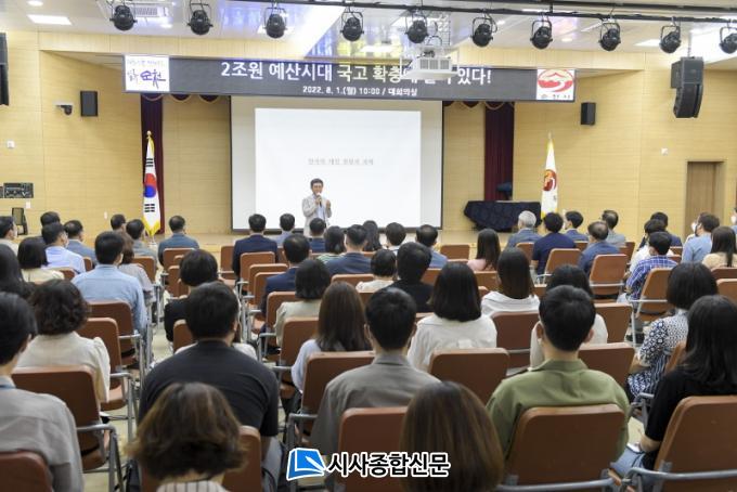 ¼øÃµ½Ã´Â 8¿ù 1ÀÏ Á¤·ÊÁ¶È¸¿¡ ¾Èµµ°É îñ ±âȹÀçÁ¤ºÎ Â÷°üÀ» ÃÊûÇÏ¿© Àü Á÷¿øÀ» ´ë»óÀ¸·Î ‛Çѱ¹ÀçÁ¤ÀÇ ÇöȲ°ú °úÁ¦¡¯¶õ ÁÖÁ¦·Î Ưº°°ÀǸ¦ ½Ç½ÃÇÏ°í ³»³âµµ ±¹°í È®Ãæ¿¡ ¿Â ÇàÁ¤·ÂÀ» ±â¿ïÀ̱â·Î Çß´Ù.