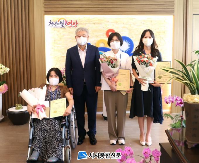 [½Ã»çÁ¾ÇսŹ® = ¿À½ÂÅà ±âÀÚ] ¿µ±¤±º(±º¼ö °Á¾¸¸)Àº Áö³ 2ÀÏ, 2022³â »ó¹Ý±â Ä£Àý°ø¹«¿øÀ¸·Î ¼±Á¤µÈ º¸°Ç¼Ò Àå°æ¼± ±º¼´ö»êº¸°ÇÁø·á¼ÒÀå, ¹®È°ü±¤°ú ¹Ú°æÈñ ÁÖ¹«°ü, ¿µ±¤À¾ ¹ÚÁöÇö ÁÖ¹«°ü 3¸íÀ» ǥâÇÏ°í °Ý·ÁÇÏ´Â ÀÚ¸®¸¦ °¡Á³´Ù.