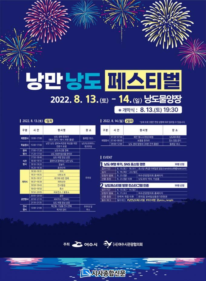 [½Ã»çÁ¾ÇսŹ® = ¿À½ÂÅà ±âÀÚ] ¿À´Â 13Àϰú 14ÀÏ, ã¾Æ°¡°í ½ÍÀº ¼¶ ³¶µµ¿¡¼ ¡®³¶¸¸ ³¶µµ Æä½ºÆ¼¹ú¡¯ÀÌ ¿¸°´Ù. ¿©¼ö½Ã(½ÃÀå Á¤±â¸í)¿Í (»ç)¿©¼ö½Ã°ü±¤ÇùÀÇȸ(ȸÀå À̼ø¹Ì)°¡ °øµ¿À¸·Î ÁÖÃÖÇÏ´Â À̹ø Çà»ç´Â ¡®»ýųì»ö°ü±¤¡¯À» ÁÖÁ¦·Î ÁÖ¹ÎÂü¿©Çü ÃàÁ¦·Î °³ÃÖµÉ ¿¹Á¤ÀÌ´Ù.