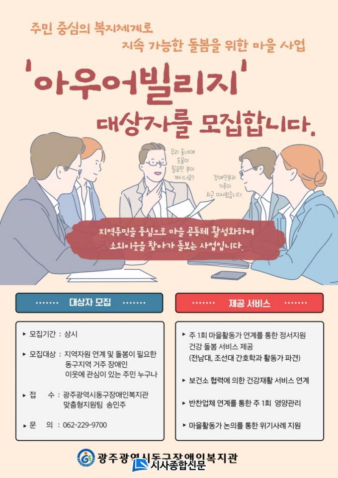 ¸¶À»È°µ¿°¡ ¸ðÁýÀº »ó½Ã ÁøÇàÇϰí ÀÖÀ¸¸ç, ÀÌ¿ô¿¡ °ü½ÉÀÌ ÀÖ´Â ´©±¸³ª Âü¿©ÇÒ ¼ö ÀÖ´Ù. ¸¶À»È°µ¿°¡¿Í ÇÔ²² ¾Æ¿ì¾îºô¸®ÁöÀÇ µµ¿òÀÌ ÇÊ¿äÇÑ ÀÌ¿ôµµ ¸ðÁýÇϰí ÀÖ´Ù. ´ë»óÀº µ¿±¸ °ü³»¿¡ °ÅÁÖÇÏ´Â Àå¾ÖÀÎÀ̸ç, º»ÀÎÀÌ Á÷Á¢ ½ÅûÇϰųª ÁÖº¯¿¡ µ¹º½°ú Áö¿ª»çȸÀÇ ¿¬°è°¡ ÇÊ¿äÇÑ ÀÌ¿ôÀ» ÃßõÇÒ ¼ö ÀÖ´Ù.