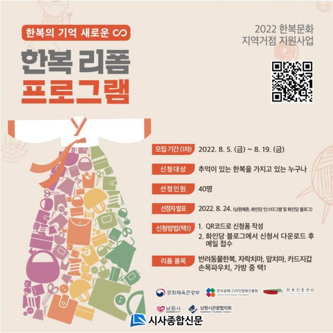ÇÑÆí ¡º2022³â ÇѺ¹¹®È Áö¿ª°ÅÁ¡ Áö¿ø»ç¾÷¡» Àº ¹®ÈüÀ°°ü±¤ºÎ¡¤Çѱ¹°ø¿¹µðÀÚÀι®ÈÁøÈï¿ø(ÇѺ¹ÁøÈï¼¾ÅÍ)ÀÇ ÁÖ°üÀ¸·Î ÁøÇàµÇ¸ç, ³²¿ø½Ã ÇÁ·Î±×·¥Àº ÇѺ¹¹®ÈÁÖ°£(10.17. ~ 10.23.)¿¡ ¸ÂÃç ³²¿ø¿¹ÃÌ ÀÏ¿ø°ú ³²¿ø´Ù¿ò°ü¡¤½Ã¸³±èº´Á¾¹Ì¼ú°ü¿¡¼ ¸¸³¯ ¼ö ÀÖ´Ù.
