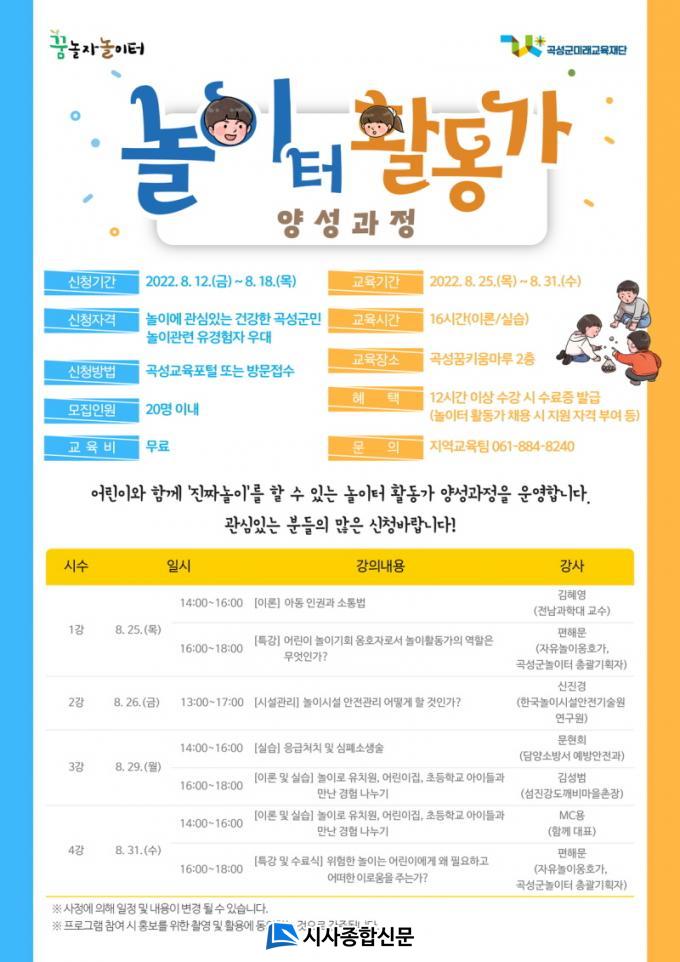 ¡®²Þ³îÀÚ ³îÀÌÅÍȰµ¿°¡ ¾ç¼º°úÁ¤¡¯ Âü¿©ÀÚ ¸ðÁýÀº 8¿ù 18ÀϱîÁö °î¼º±³À°Æ÷ÅРȨÆäÀÌÁö(https://www.gokseong.go.kr/edu/)¸¦ ÅëÇØ ½ÅûÇϰųª °î¼º±º¹Ì·¡±³À°Àç´Ü¿¡ Á÷Á¢ ¹æ¹®ÇÏ¿© Á¦ÃâÇÏ¸é µÈ´Ù. ¾ç¼º°úÁ¤Àº 8¿ù 25ÀϺÎÅÍ 8¿ù 31ÀϱîÁö ¿î¿µÇϰí ÀÌ·Ð, ½Ç½À, Ư°À¸·Î ÃÑ 4ȸÂ÷ 16½Ã°£À¸·Î ÁøÇàÇÑ´Ù. ÀÚ¼¼ÇÑ »çÇ×Àº °î¼º±º¹Ì·¡±³À°Àç´Ü(061-884-8240)À¸·Î ¹®ÀÇÇÏ¸é µÈ´Ù.