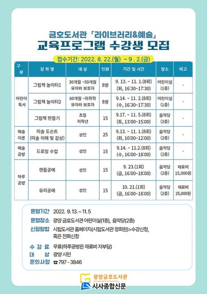 ÇÑÆí, À̹ø ±³À°ÇÁ·Î±×·¥ÀÇ ¼ö°»ýÀº 8¿ù 22ÀϺÎÅÍ ½Ã¸³µµ¼°ü ȨÆäÀÌÁö¿¡¼ ¼±Âø¼øÀ¸·Î ¸ðÁýÇϸç, ±³À°ÇÁ·Î±×·¥ÀÇ ÀÏÁ¤°ú ³»¿ëÀº ±¤¾ç½Ã¸³µµ¼°ü ȨÆäÀÌÁö(lib.gwangyang.go.kr)¸¦ ¹æ¹®Çϰųª ±¤¾ç±ÝÈ£µµ¼°ü(¢Ï061-797-3846)À¸·Î ¹®ÀÇÇÏ¸é µÈ´Ù.