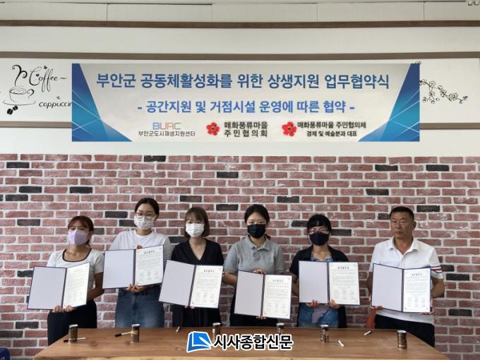 À̳¯ Çù¾à½Ä¿¡´Â ºÎ¾È±º µµ½ÃÀç»ýÁö¿ø¼¾ÅÍ(¼¾ÅÍÀå ±èÇ×Áý), ¸ÅÈdz·ù¸¶À» ÁÖ¹ÎÇùÀÇȸ(´ëÇ¥ º¯¿µ¹è), ½Ã°í¸£Ã»Ãá(´ëÇ¥ À±³ª¿¬), Ä¿ÇǸ¦ ÀÕ´Â ¸¶À»(´ëÇ¥ ¹®¼±¾Æ), ¾îºÎ¹Ù(´ëÇ¥ ½ÉÀç¸í), ¾ÆÆ®ÆÊ(´ëÇ¥ ½É¼ºÈñ)°¡ Âü¼®ÇÏ¿© ÁøÇàµÇ¾úÀ¸¸ç ºÎ¾È±º ³» µµ½ÃÀç»ý Ȱ¼ºÈ¿Í °øµ¿Ã¼ ¹ßÀüÀ» ¾à¼ÓÇϰí ÃÑ 4°³ÀÇ °ÅÁ¡½Ã¼³(â¾÷Ç÷§Æû 1µ¿ 2È£ ¹× 2µ¿, ¾î¿ï¸²½¦¾îÇϿ콺, ¹®È¿¹¼ú°ø¹æ) °øµ¿ ¿î¿µ¿¡ ´ëÇØ °¢ÀÚÀÇ ¿ªÇÒ¿¡¼ ÃÖ¼±À» ´ÙÇϱâ·Î ÇÏ¿´´Ù.