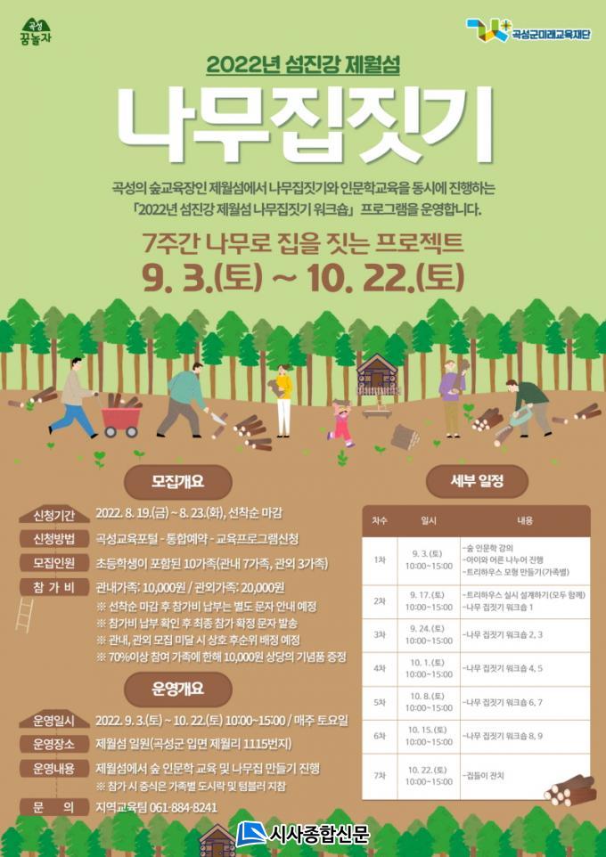 ¡®2022³â ¼¶Áø° Á¦¿ù¼¶ ³ª¹«ÁýÁþ±â ¿öÅ©¼ó¡¯ÇÁ·Î±×·¥ Âü°¡ ½ÅûÀº 8¿ù 23ÀϱîÁö °î¼º±³À°Æ÷ÅРȨÆäÀÌÁö(https://www.gokseong.go.kr/edu)¸¦ ÅëÇØ ¼±Âø¼øÀ¸·Î ÁøÇàµÇ¸ç, ÃʵîÇлýÀÌ Æ÷ÇÔµÈ °ü³» 7°¡Á·°ú °ü¿Ü 3°¡Á· ÃÑ 10°¡Á·À» ¸ðÁýÇÑ´Ù.