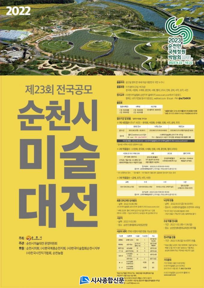 23ȸ ¼øÃµ½ÃÀü ÀÛǰÁ¢¼ö´Â 1Â÷ »çÁøÁ¢¼ö(¿ìÆí) Çѱ¹È, ¼¾çÈ, ¼öäÈ, ¹ÎÈ, ¼°¢, °ø¿¹, Á¶°¢ ºÐ¾ßÀ̸ç 9¿ù 7ÀÏ(¼ö) ¿ÀÈÄ 6½Ã ¿ìÆíµµÂøºÐ¿¡ ÇÑÇϰí, 1Â÷ ½É»ç°á°ú ¹ßÇ¥´Â 9¿ù 14ÀÏ, 2Â÷ ½É»ç°á°ú ¹ßÇ¥´Â ¿À´Â 10¿ù 6ÀÏ·Î ¼øÃµ¹ÌÇù ȨÆäÀÌÁö¿Í °³º°ÅëÁö ÇÒ ¿¹Á¤ÀÌ´Ù.