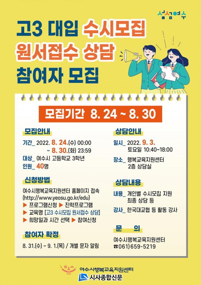 | ¿©¼ö½Ã, 2023Çг⵵ ¡®´ëÀÔ ¼ö½Ã¸ðÁý ¿ø¼Á¢¼ö »ó´ã¡¯ ¿î¿µ °í3 ¼öÇè»ý 40¸í ´ë»ó¡¦9¿ù 3ÀÏ ¿©¼ö½ÃÇູ±³À°Áö¿ø¼¾ÅÍ¿¡¼ »ó´ã