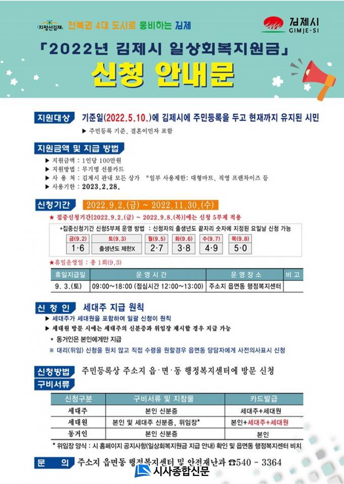 ³»´Þ 2ÀϺÎÅÍ 11¿ù 30ÀϱîÁö À¾¸éµ¿ÇàÁ¤º¹Áö¼¾ÅÍ¿¡¼ Áö±ÞÇÏ´Â ÀÏ»óȸº¹Áö¿ø±ÝÀº¡®22. 5. 10(È) 24½Ã ±âÁØ ±èÁ¦½Ã¿¡ Áֹεî·ÏµÈ ½Ã¹Î(°áÈ¥À̹ÎÀÚ Æ÷ÇÔ) 81,091¸íÀÌ ´ë»óÀ̸ç, 1Àδç 100¸¸¿ø¾¿ ¹«±â¸í¼±ºÒÄ«µå·Î Áö±ÞµÈ´Ù.