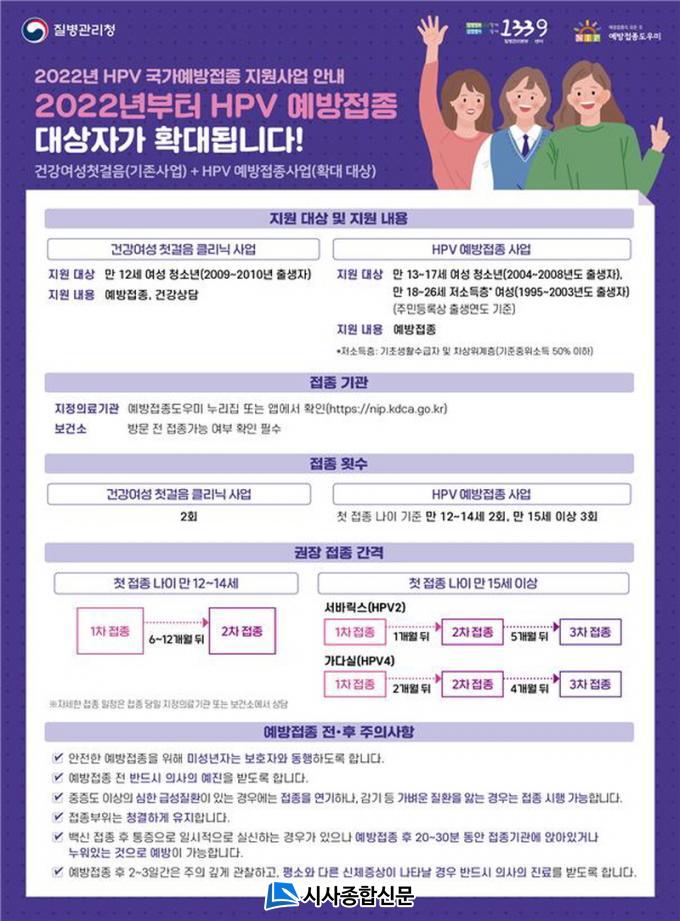 »ç¶÷À¯µÎÁ¾¹ÙÀÌ·¯½º(HPV) ±¹°¡¿¹¹æÁ¢Á¾ Áö¿ø ´ë»óÀº ±âÁ¸ ¸¸ 12¼¼ ¿©¼º û¼Ò³â¿¡¼ ¸¸12~17¼¼ ¿©¼º û¼Ò³â, ¸¸ 18~26¼¼ Àú¼ÒµæÃþ ¿©¼ºÀ¸·Î È®´ë(¡¯22.3.14.~)µÆÀ¸¸ç, HPV ±¹°¡¿¹¹æÁ¢Á¾ Áö¿ø ´ë»óÀÚ´Â °¡±î¿î ÁöÁ¤ÀÇ·á±â°ü (¶Ç´Â º¸°Ç¼Ò)¿¡¼ ¹«·á·Î ¿¹¹æÁ¢Á¾À» ¹ÞÀ» ¼ö ÀÖ´Ù. ÁöÁ¤ÀÇ·á±â°üÀº ¿¹¹æÁ¢Á¾µµ¿ì¹Ì ȨÆäÀÌÁö ¹× ½º¸¶Æ®Æù ¾Û¿¡¼ È®ÀÎ °¡´É