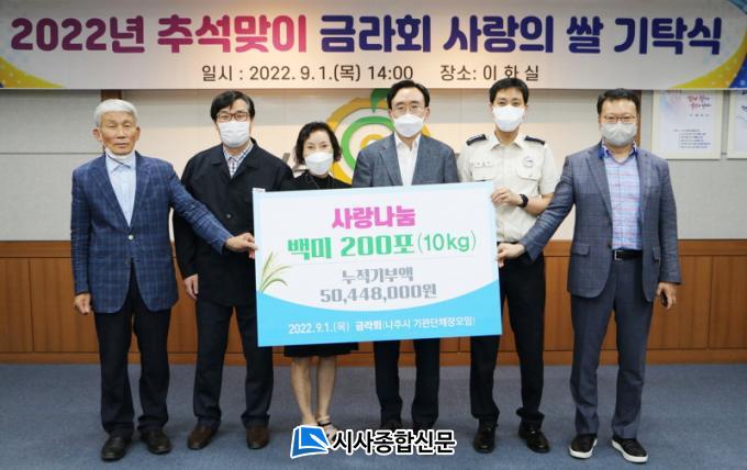 ½Ãû ÀÌȽǿ¡¼ ÁøÇàµÈ ±âŹ½Ä¿¡´Â À±º´Å ½ÃÀå, ¹Ú¿ëÁÖ ¼Ò¹æ¼Àå, ¹ÚÀ±ÀÚ ±³À°Áö¿øÃ» ±³À°Àå, ±Ç¿ë´ë ³óÇù³ªÁÖ½ÃÁöºÎÀå, ±è±Ôµ¿ ÃàÇùÁ¶ÇÕÀå, ±Ç¿µÈÆ KT&G³ªÁÖÁö»çÀå µî ±Ý¶óȸ¿ø 6¸íÀÌ Âü¼®Çß´Ù. ±âŹ ½ÒÀº 10kg¹é¹Ì 200Æ÷´ë(450¸¸¿ø »ó´ç)·Î Ãß¼® ¿¬ÈÞ Àü±îÁö Ȧ¸ö ¾î¸£½Å, ´Ù¹®È°¡Á¤, Á¶¼Õ°¡Á¤ µî Ãë¾à°èÃþ 100°¡±¸¿¡ 2Æ÷´ë¾¿ Àü´ÞµÉ ¿¹Á¤ÀÌ´Ù.