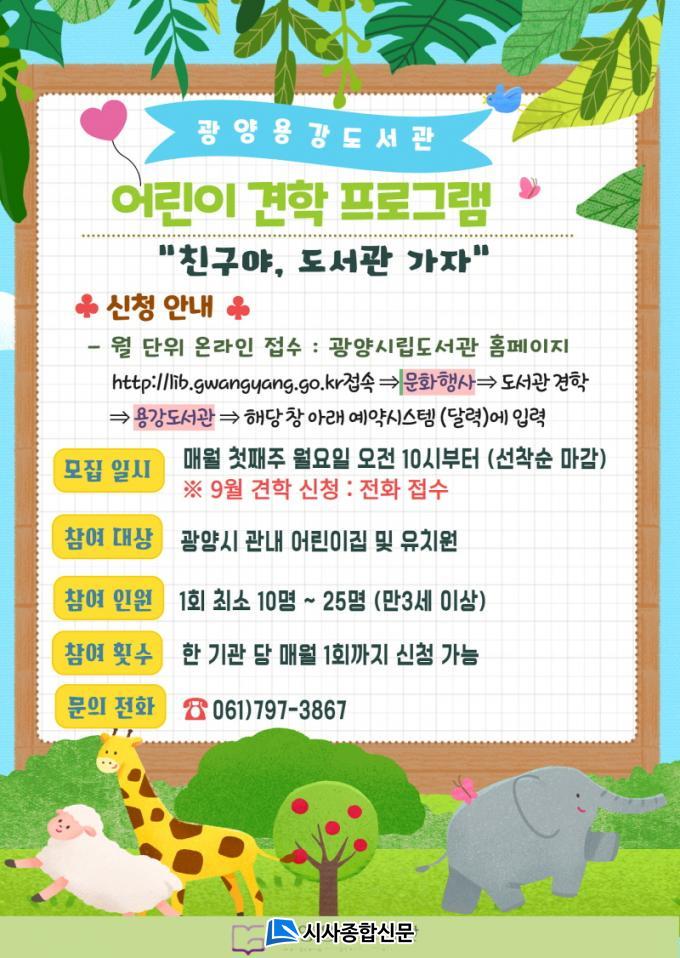 ÇØ´ç ÇÁ·Î±×·¥Àº Áö¿ª ³» ¾î¸°ÀÌÁý°ú À¯Ä¡¿øÀ» ´ë»óÀ¸·Î 9¿ù 13ÀÏ~12¿ù 19ÀÏ ¸ÅÁÖ 2ȸ(È, ¸ñ¿äÀÏ) ¿î¿µµÈ´Ù. Âü°¡¸¦ Èñ¸ÁÇÏ´Â ±â°üÀº ¸Å¿ù ù° ÁÖ ¿ù¿äÀϺÎÅÍ ±¤¾ç½Ã¸³µµ¼°ü ȨÆäÀÌÁö(lib.gwangyang.go.kr)¸¦ ÅëÇØ ½Åû °¡´ÉÇϰí, 9¿ù °ßÇнÅûÀº ÀüÈ·Î Á¢¼öÇÒ ¿¹Á¤ÀÌ´Ù.