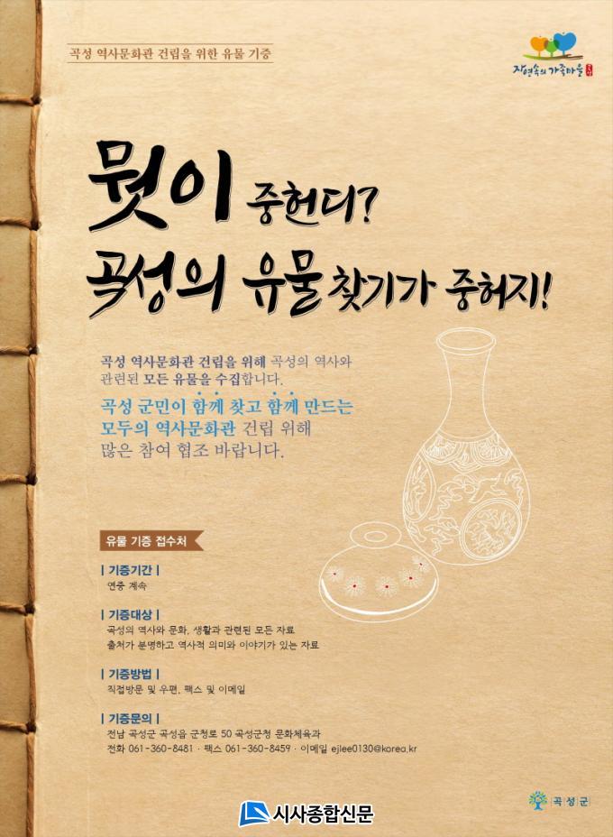 À¯¹° Á¢¼ö ±â°£Àº ±Ý³â 9¿ù 6ÀϺÎÅÍ 12¿ù 31ÀϱîÁö´Ù. ±âÁõÀ» ÇÏ·Á¸é ¸ÕÀú °î¼º±º ¹®ÈüÀ°°ú ¹®ÈÀç°ü¸®ÆÀ¿¡ ±âÁõ ¹× ±âŹ ½Åû¼¸¦ Á¦ÃâÇÏ¸é µÈ´Ù. Á¦Ãâ ¹æ¹ýÀº ¿ìÆí(°î¼º±º °î¼ºÀ¾ ±ºÃ»·Î 50, °î¼º±º ¹®ÈüÀ°°ú) ¶Ç´Â À̸ÞÀÏ(