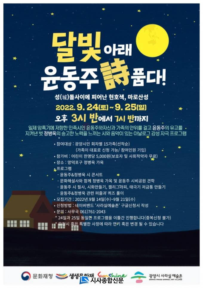ÇÑÆí, ¡®´Þºû ¾Æ·¡ À±µ¿ÁÖ ãÌ Ç°´Ù¡¯´Â ±¤¾ç½Ã¹ÎÀ» ´ë»óÀ¸·Î 1ÀÏ 15°¡Á·¾¿ ÃÑ 30°¡Á·À» ¼±Âø¼ø ¸ðÁýÇÒ °èȹÀ¸·Î 9¿ù 21ÀϱîÁö Âü°¡ ½ÅûÀ» ¹ÞÀ¸¸ç, ±âŸ ÀÚ¼¼ÇÑ ¹®ÀÇ´Â ±¤¾ç½Ã »ç¶ó½Ç¿¹¼úÃÌ »ç¹«±¹(¢Ï061-761-2043)À¸·Î ÇÏ¸é ¾Ë ¼ö ÀÖ´Ù.