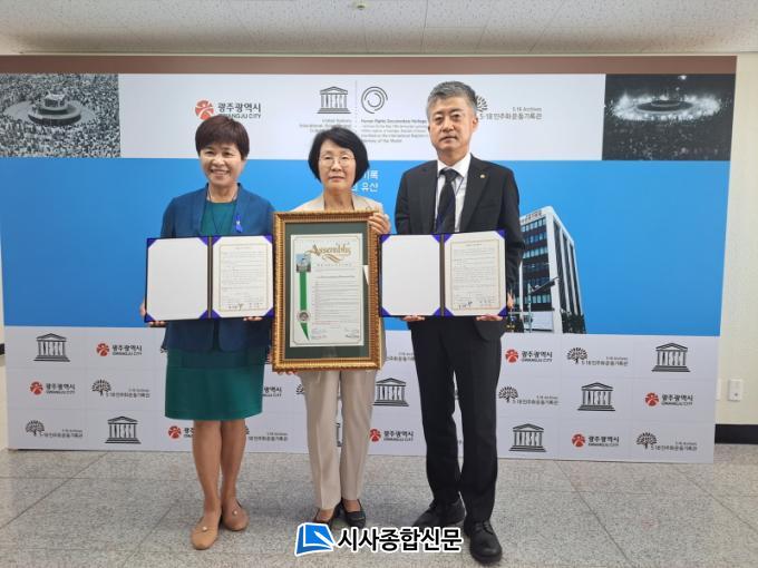 ÀÌ¿Í °ü·Ã, 5‧18¹ÎÁÖȿ±â·Ï°üÀº À̳¯ ¹Ì±¹ ͏®Æ÷´Ï¾ÆÁÖ 5¡¤18¹ÎÁÖȿ±â³äÀÏ Á¦Á¤ °áÀÇ¾È ÁغñÀ§¿øÈ¸ ¹Ì±¹ ÇöÁö ´ëÇ¥´ÜÀ¸·ÎºÎÅÍ ¾×ÀÚ·Î Á¦ÀÛµÈ ±â³äÀÏ Á¦Á¤°áÀǾÈÀ» ±âÁõ¹Þ°í, ±âÁõÇù¾à½ÄÀ» ü°áÇß´Ù.