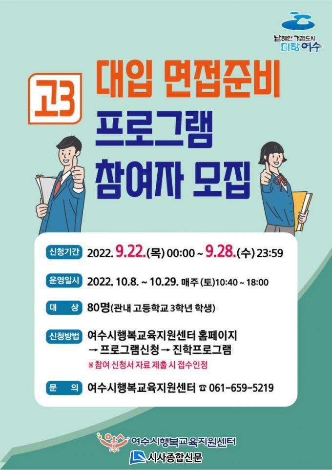 [½Ã»çÁ¾ÇսŹ® = ¿À½ÂÅà ±âÀÚ] ¿©¼ö½Ã(½ÃÀå Á¤±â¸í)°¡ °íµîÇб³ 3Çг⠼öÇè»ýÀ» ´ë»óÀ¸·Î ¡®´ëÀÔ ¼ö½ÃÀüÇü ¸éÁ¢Áغñ Áö¿ø ÇÁ·Î±×·¥¡¯À» ¿î¿µÇÑ´Ù. À̹ø ÇÁ·Î±×·¥Àº ¿©¼ö½ÃÇູ±³À°Áö¿ø¼¾ÅÍ »ó´ã½Ç¿¡¼ 10¿ù 8ÀÏ~29ÀÏ ¸ÅÁÖ Åä¿äÀÏ ¿ÀÀü 10½Ã 40ºÐºÎÅÍ ¿ÀÈÄ 6½Ã±îÁö ¿î¿µµÉ ¿¹Á¤ÀÌ´Ù.