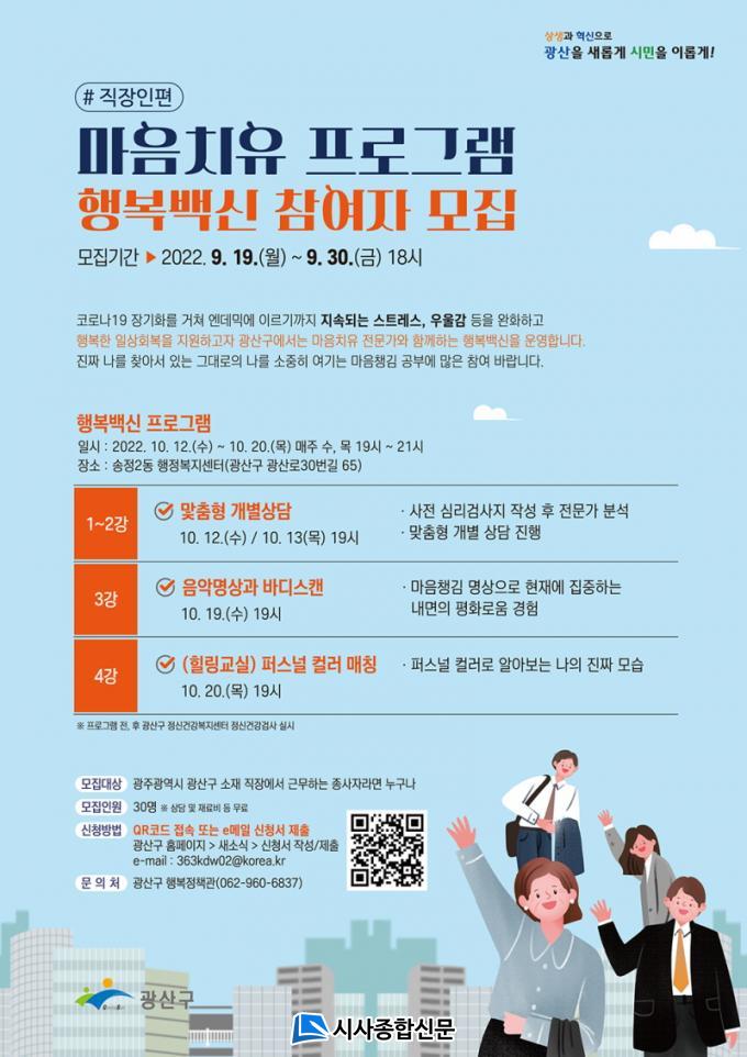 ½ÅûÀº ±¤»ê±¸ ´©¸®Áý ¡®»õ¼Ò½Ä¡¯¶õ¿¡¼ ¡®¸¶À½Ã¬±èÇÁ·Î±×·¥ Çູ¹é½Å Âü¿©ÀÚ ¸ðÁý(Á÷ÀåÀÎÆí)¡¯¿¡ µé¾î°¡ ½Åû¼¸¦ ÀÛ¼º, À̸ÞÀÏ(363kdw02@korea.kr)·Î Á¦ÃâÇÏ¸é µÈ´Ù. °ü·Ã È«º¸¹°¿¡ Àִ ť¾Ë(QR) Äڵ忡 Á¢¼ÓÇØ ½ÅûÇÏ´Â °Íµµ °¡´ÉÇÏ´Ù.