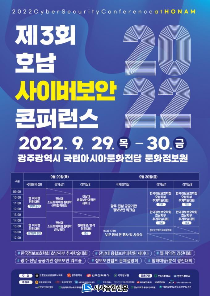 Àü³²´ëÇб³´Â µ¿½Å´ë¿Í °øµ¿À¸·Î 9¿ù 29~30ÀÏ ÀÌÆ²°£ ±¹¸³¾Æ½Ã¾Æ¹®ÈÀü´ç¿¡¼ ¡¯2022 È£³² »çÀ̹öº¸¾È ÄÁÆÛ·±½º¸¦ °®°í, »çÀ̹öº¸¾ÈÀÇ Á߿伺À» ÀüÆÄÇÏ´Â µ¿½Ã¿¡ »çÀ̹ö °ø°ÝÀÇ ½ÇÅÂ¿Í À¯Çü, ÀÌ¿¡ ´ëÇÑ ´ëÀÀÃ¥ µîÀ» °±¸ÇÏ°Ô µÈ´Ù.