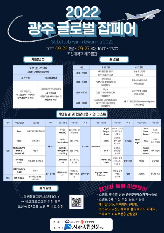 2022 ±¤ÁÖ ±Û·Î¹ú ÀâÆä¾î´Â 26~27ÀÏ Á¶¼±´ëÇб³ e½ºÆ÷Ã÷ °æ±âÀå¿¡¼ ¿¸®¸ç ÇØ¿ÜÃë¾÷À» Èñ¸ÁÇϴ û³âÀÌ¸é ´©±¸³ª Âü¿©°¡ °¡´ÉÇÏ´Ù. ÇØ¿ÜÃë¾÷À» Èñ¸ÁÇÏ´Â ÇлýµéÀ» À§ÇØ ¡ãÀϺ» ¡ã¹Ì±¹ ¡ãij³ª´Ù ¡ãÁß±¹ ¡ã½Ì°¡Æ÷¸£ ¡ã¸»·¹ÀÌ½Ã¾Æ ¡ã ÀϺ»µî ÇØ¿ÜÃë¾÷ ÁغñÀü·«, ÇØ¿ÜÁøÃâ ±â¾÷ ¼³¸íȸ, ¿µ¹®/ ÀϹ® À̷¼ ÀÛ¼º¹ý, ÇØ¿Ü ±¸Àαâ¾÷ Àλç´ã´çÀÚ¿Í ±¸Á÷ÀÚ°£ ´ë¸é/È»ó¸éÁ¢, 1:1 ÇØ¿ÜÃë¾÷»ó´ã µî ´Ù¾çÇÑ ÇÁ·Î±×·¥ÀÌ ¿î¿µµÈ´Ù.
