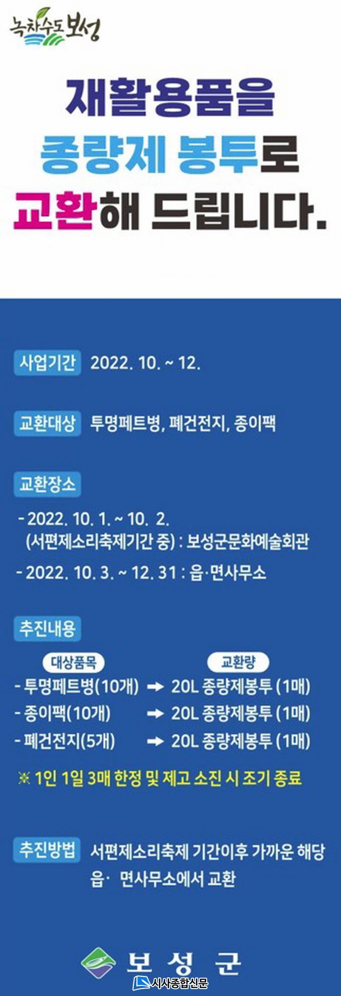 [½Ã»çÁ¾ÇսŹ® = ¿À½ÂÅà ±âÀÚ] º¸¼º±ºÀÌ ÀçȰ¿ëǰ ÀÎ½Ä °³¼±À» À§ÇØ 10¿ùºÎÅÍ 12¿ù±îÁö ÀçȰ¿ëǰÀ» ¡®Á¾·®Á¦ ºÀÅõ(20L) ¡¯·Î ¹Ù²ãÁÖ´Â ±³È¯Çà»ç¸¦ ÁøÇàÇÑ´Ù.