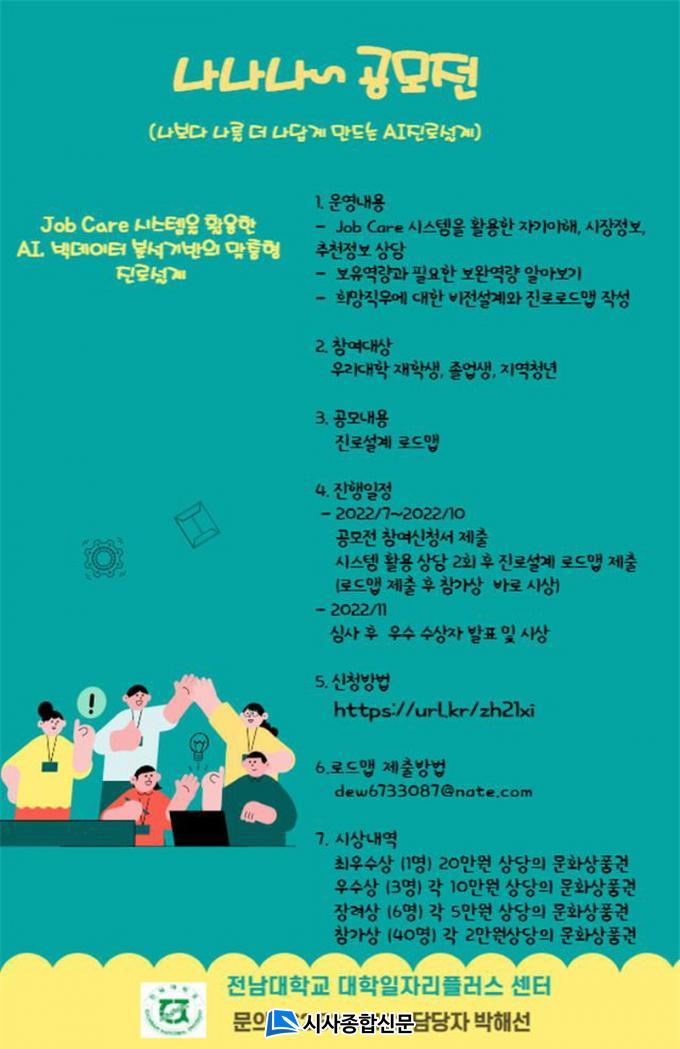 [½Ã»çÁ¾ÇսŹ® = ¿À½ÂÅà ±âÀÚ] Àü³²´ëÇб³ ´ëÇÐÀÏÀÚ¸®Ç÷¯½º¼¾ÅÍ(¼¾ÅÍÀå ³²È£Á¤ ±³¼ö)´Â 11¿ù±îÁö Çѱ¹°í¿ëÁ¤º¸¿ø Áö´ÉÇü Á÷¾÷»ó´ãÁö¿ø¼ºñ½º(ÀÌÇÏ Àâ ÄÉ¾î ¼ºñ½º)¸¦ Ȱ¿ëÇÑ ¡¸³ªº¸´Ù ³ª¸¦ ´õ ³ª´ä°Ô ¸¸µå´Â AIÁø·Î¼³°è °ø¸ðÀü¡¹À» ¿î¿µÇÑ´Ù.