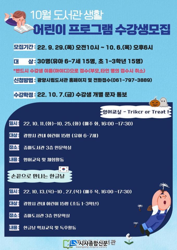 [½Ã»çÁ¾ÇսŹ® = Àå¹Î±Ô ±âÀÚ] ±¤¾çÁ߸¶µµ¼°üÀº ¾î¸°ÀÌ µ¶¼¿Í µµ¼°ü ÀÌ¿ë ÁõÁøÀ» À§ÇØ ¿À´Â 10¿ù 11~27ÀÏ(3ÁÖ°£) ¾î¸°ÀÌ(À¯¾Æ 6~7¼¼)¿Í ÃʵîÇлý(1~3Çгâ)À» ´ë»óÀ¸·Î µ¶¼¹®È ÇÁ·Î±×·¥¿¡ Âü¿©ÇÒ ¼ö°»ýÀ» ¸ðÁýÇÑ´Ù.