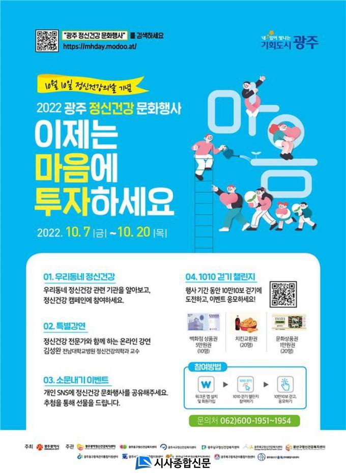 ±¤Áֽð¡ ÁÖÃÖÇÏ°í ±¤ÁÖ±¤¿ªÁ¤½Å°Ç°º¹Áö¼¾ÅÍ, 5°³±¸ Á¤½Å°Ç°º¹Áö¼¾ÅÍ, 5°³±¸ Áßµ¶°ü¸®ÅëÇÕÁö¿ø¼¾ÅͰ¡ °øµ¿À¸·Î ÁÖ°üÇÏ´Â À̹ø Çà»ç´Â ¡®ÀÌÁ¦´Â ¸¶À½¿¡ ÅõÀÚÇϼ¼¿ä¡¯¶ó´Â ÁÖÁ¦·Î, Á¤½Å°Ç° È«º¸ÁÖ°£(10¿ù7ÀÏ~10¿ù20ÀÏ) ÁøÇàµÇ¸ç, ¿Â¡¤¿ÀÇÁ¶óÀο¡¼ µ¿½Ã¿¡ Âü¿©ÇÒ ¼ö ÀÖ´Ù.