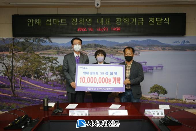 [½Ã»çÁ¾ÇսŹ® = ¿À½ÂÅà ±âÀÚ] ½Å¾È±º Áö¿ª¾÷ü ¼¶¸¶Æ® ´ëÇ¥ Á¤È¸¿µ¾¾°¡ Áö¿ªÀÎÀç¾ç¼ºÀ» À§ÇØ ½á´Þ¶ó¸ç Áö³ 12ÀÏ (Àç)½Å¾È±ºÀåÇÐÀç´Ü(ÀÌ»çÀå ¹Ú¿ì·®)¿¡ 1õ¸¸¿øÀÇ ÀåÇбÝÀ» ¾àÁ¤Çß´Ù.