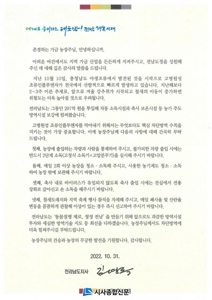 ±è¿µ·Ï Àü³²µµÁö»ç´Â ¼Çѹ®À» ÅëÇØ ¡°Áö³ 10¿ù Ãæ³²¿¡¼ °íº´¿ø¼º Á¶·ùÀÎÇ÷翣ÀÚ°¡ °ËÃâµÈ °ÍÀ» ½ÃÀÛÀ¸·Î Àü±¹ ¾ß»ýÁ¶·ù¿Í °¡±Ý³óÀåÀ¸·Î ºü¸£°Ô È®»êÇϰí ÀÖ´Ù¡±¸ç ¡°µµ³» À¯ÀÔÀ» ¸·±â À§ÇØ °¡±Ý³óÀå¿¡¼ ÇÙ½É ¹æ¿ª¼öÄ¢À» öÀúÈ÷ ÁöÄÑÁÙ °Í¡±À» °Á¶Çß´Ù.