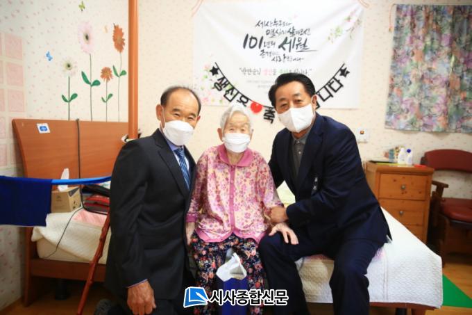 [½Ã»çÁ¾ÇսŹ® = ¿À½ÂÅà ±âÀÚ] °î¼º±º(±º¼ö ÀÌ»óö)ÀÌ 100¼¼¸¦ ¸ÂÀÌÇÑ °í·É ÁֹΠ4¸í¿¡°Ô ´ëÅë·É ÃàÇÏ ¼ÇѰú ÇÔ²² û·ÁÀå°ú Àå¼ö ±â³ä ¼±¹°À» Àü´ÞÇß´Ù°í ¹àÇû´Ù.