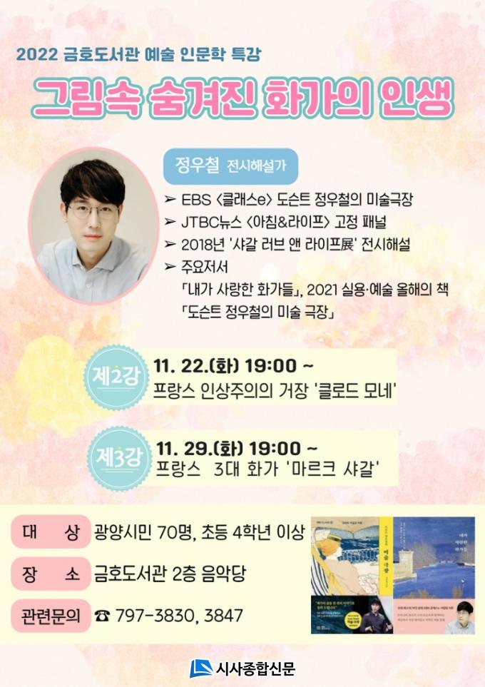 ¡®±×¸² ¼Ó Ȱ¡ÀÇ Àλý¡¯ °Á¿¡ ´ëÇØ ±Ã±ÝÇÑ »çÇ×Àº ±¤¾ç½Ã¸³µµ¼°ü ȨÆäÀÌÁö(lib.gwangyang.go.kr)¸¦ Âü°íÇϰųª ±¤¾ç±ÝÈ£µµ¼°ü(¢Ï061-797-3847)À¸·Î ¹®ÀÇÇϸé ÀÚ¼¼È÷ ¾È³»¹ÞÀ» ¼ö ÀÖ´Ù.