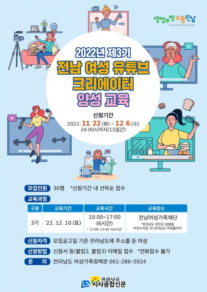 Á¦3±â ¿©¼º À¯Æ©ºê Å©¸®¿¡ÀÌÅÍ ¾ç¼º°úÁ¤Àº À¯Æ©ºê ÄÜÅÙÃ÷ Á¦ÀÛ¿¡ ³¢¿Í ¿Á¤À» °âºñÇÑ Àü³²Áö¿ª ¿©¼ºÀÌ¸é ´©±¸³ª ½ÅûÇÒ ¼ö ÀÖ´Ù. À̸ÞÀÏ(kjy5154@korea.kr)À» ÅëÇØ ¼±Âø¼ø 30¸íÀ» ¸ðÁý, ±³À°À» ¿î¿µÇϸç, ±³À°Àº 12¿ù 10ÀÏ Àü³²¿©¼º°¡Á·Àç´Ü(¹«¾È±º ¼ÒÀç)¿¡¼ ÁøÇàÇÑ´Ù.