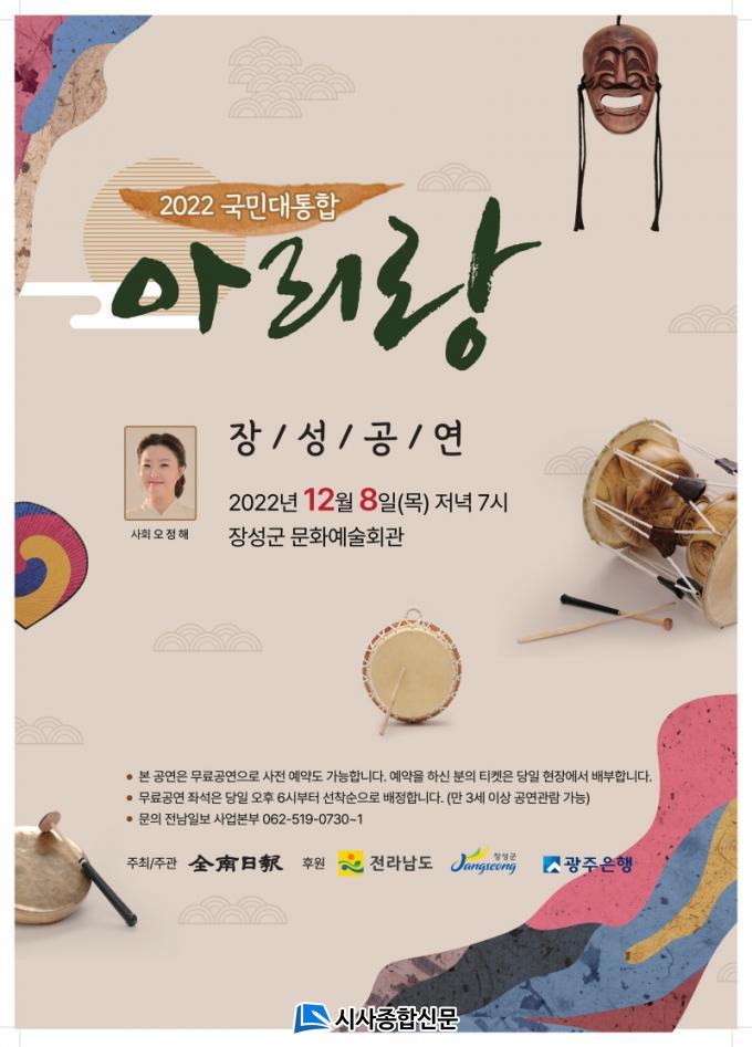 ¿ì¸®³ª¶ó 3´ë ¾Æ¸®¶ûÀ¸·Î ²ÅÈ÷´Â Áøµµ¾Æ¸®¶û, Á¤¼±¾Æ¸®¶û, ¹Ð¾ç¾Æ¸®¶ûÀ» Áß½ÉÀ¸·Î ÇÑ ¡®ÆÈµµ ¾Æ¸®¶û¡¯°ú Ÿ¾Ç±â ¿¬ÁÖ·Î ±¸¼ºµÈ ¡®ºÏÀÇ ¾Æ¸®¶û¡¯, dz¹°·Î »õ·Ó°Ô Æí°îÇÑ ¡®ºø¼ÓÀÇ ¾Æ¸®¶û¡¯ µî ´Ùä·Î¿î ¾Æ¸®¶û °ø¿¬ÀÌ ÆîÃÄÁø´Ù. »çȸ´Â ¡®¼ÆíÁ¦¡¯ÀÇ ÁÖÀΰøÀÎ ¿ÀÁ¤ÇØ µ¿¾Æ¹æ¼Û¿¹¼ú´ëÇб³ ±³¼ö°¡ ¸Ã´Â´Ù. ¸¸ 3¼¼ ÀÌ»ó ´©±¸³ª °ü¶÷ÇÒ ¼ö ÀÖÀ¸¸ç, Àü Á¼® ¹«·á °ø¿¬ÀÌ´Ù.