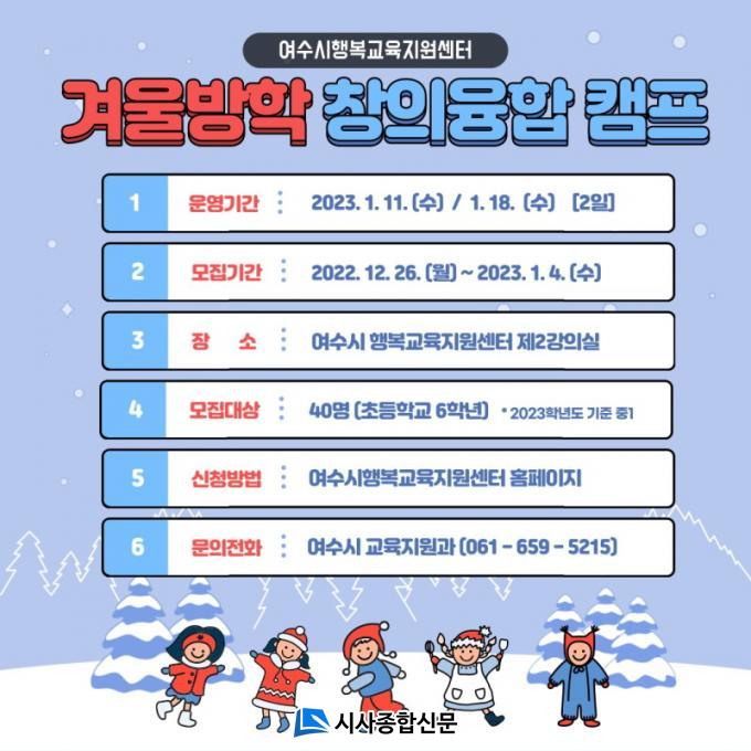 Ä·ÇÁ Âü°¡¸¦ ¿øÇÏ´Â ÇлýÀº ¿À´Â 12¿ù 26ÀϺÎÅÍ ³»³â 1¿ù 4ÀϱîÁö ¿©¼ö½ÃÇູ±³À°Áö¿ø¼¾ÅÍ È¨ÆäÀÌÁö(https://www.yeosu.go.kr/edu)¿¡¼ ½ÅûÇÏ¸é µÈ´Ù.