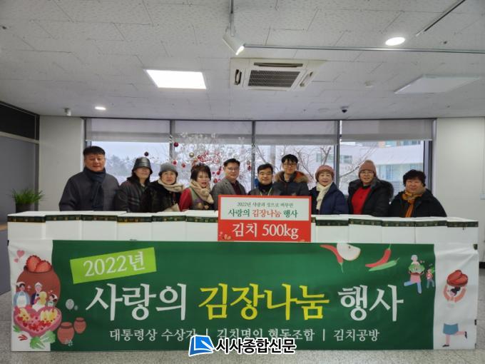 À̳¯ Àü´Þ½ÄÀº ´ëÅë·É»ó¼ö»óÀÚ ±èÄ¡¸íÀÎÇùµ¿Á¶ÇÕ ¹ÚÇý¶õ ´ëÇ¥¿Í ÃÖÀμø, À̱¤Èñ, ±èÈ£¿Á, ¼Âù¿, ±èÈ¿¼÷, Àå°æ¾Ö, ±èÀμ÷ µî ±èÄ¡¸íÀÎ 8¸íÀÌ ¸ð¿© ±èÀå±èÄ¡ 500kg(8¹é¿©¸¸¿ø »ó´ç)¸¦ Á÷Á¢ ´ã°¡ ±¤Áֽø³Àå¾ÖÀκ¹Áö°ü ÀÓÁ÷¿øÀÌ Âü¼®ÇÑ °¡¿îµ¥ Àü´Þ½ÄÀ» ÁøÇàÇß´Ù.