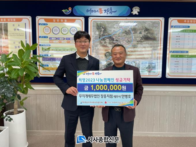 [½Ã»çÁ¾ÇսŹ® = ¿À½ÂÅà ±âÀÚ] ¹«Áö°³¼¼¹«¹ýÀÎ ÀåÈïÁö»ç ¾Èº´È£ ¼¼¹«»ç´Â 27ÀÏ ÀÌ¿ôµ½±â ¼º±Ý 100¸¸¿øÀ» ÀåÈïÀ¾ Áö¿ª»çȸº¸ÀåÇùÀÇü(°øµ¿À§¿øÀå ±æÇöÁ¾, °°æÀÏ)¿¡ ±âŹÇß´Ù.
