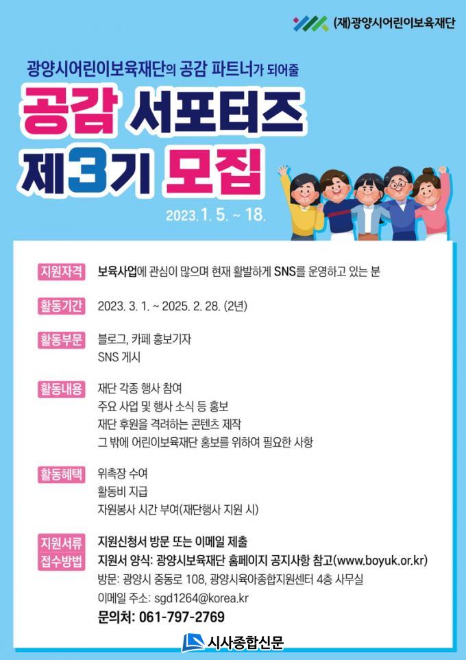 ¼Æ÷ÅÍÁî Ȱµ¿¡¤¸ðÁý°ú °ü·ÃµÈ ±âŸ ¹®ÀÇ »çÇ×Àº ±¤¾ç½Ã¾î¸°À̺¸À°Àç´Ü(¢Ï061-797-2769)À¸·Î ¹®ÀÇÇÏ¸é ¾Ë ¼ö ÀÖ´Ù.
