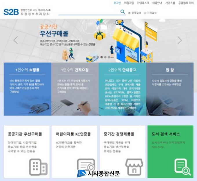 Çѱ¹±³Á÷¿ø°øÁ¦È¸°¡ ¿î¿µÇÏ´Â S2B´Â Áö¹æ°è¾à¹ýÀ» Àû¿ë¹Þ´Â ¸ðµç °ø°ø±â°üÀÌ °ø»ç, ¿ë¿ª ¹× ¹°Ç°ÀÇ Á¦Á¶¡¤±¸¸Å ÀÔÂû¿¡ ÀÌ¿ëÇϵµ·Ï ÇàÁ¤¾ÈÀüºÎ Àå°üÀÌ ÀÌ¿ëÀ» ±ÔÁ¤ÇÑ ÁöÁ¤Á¤º¸Ã³¸®ÀåÄ¡´Ù. ±³À°±â°ü µî ¾à 1¸¸6700¿©°³ ±â°üÀÌ °¡ÀԵŠÀü³âµµ Á¶´Þ °Ç¼ö 91¸¸°Ç, Á¶´Þ ±Ý¾× 1Á¶1855¾ï¿øÀÇ ÀÌ¿ë·üÀ» º¸À̰í ÀÖ´Ù.