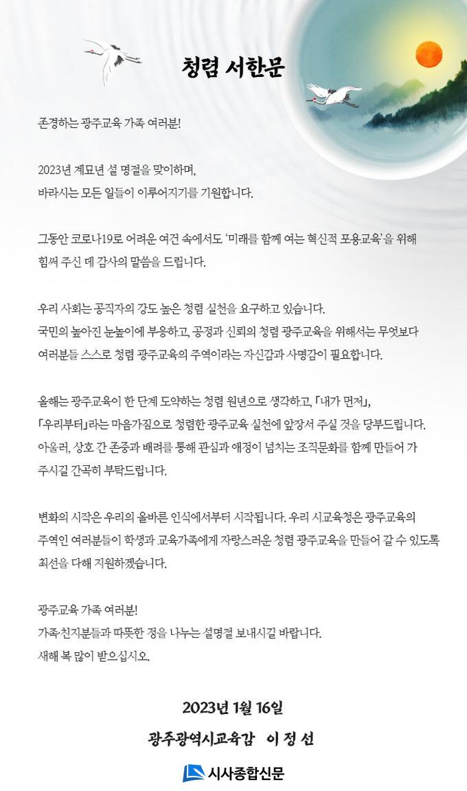 [½Ã»çÁ¾ÇսŹ® = ¿À½ÂÅà ±âÀÚ] ÀÌÁ¤¼± ±³À°°¨ÀÌ 2023³â °è¹¦³â ¼³ ¸íÀýÀ» ¸ÂÀÌÇØ û·Å ÀÇÁö¿Í ´çºÎ¸¦ ´ãÀº û·Å ¼Çѹ®À» Àüü ±â°ü ¹× Çб³¿¡ ¹ß¼ÛÇß´Ù.