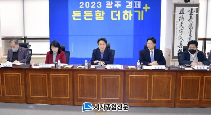 ° ½ÃÀåÀº 18ÀÏ ¿ÀÈÄ ±¤ÁÖ°æÁ¦°í¿ëÁøÈï¿ø¿¡¼ Á¦7Â÷ ¹Î»ý°æÁ¦´ëÃ¥º»ºÎȸÀǸ¦ ¿¾î ¡®2023 ±¤ÁÖ °æÁ¦, µçµçÇÔ ´õÇϱâ+¡¯ Á¤Ã¥ Àü·«À» ¹ßÇ¥Çß´Ù. ° ½ÃÀåÀº ¿ÃÇØÀÇ °æÁ¦Àü·« ¹ßÇ¥¿¡ ÀÌ¾î ¼Ò»ó°øÀÎ Áö¿øÃ¥, Áß¼Ò±â¾÷ ¼öÃâ ÆÇ·Î È®´ë µî °æÁ¦ À§±â µ¹ÆÄ±¸ ¸¶·ÃÀ» À§ÇØ À¯°ü±â°ü°ú ¸Ó¸®¸¦ ¸Â´ò´Ù.