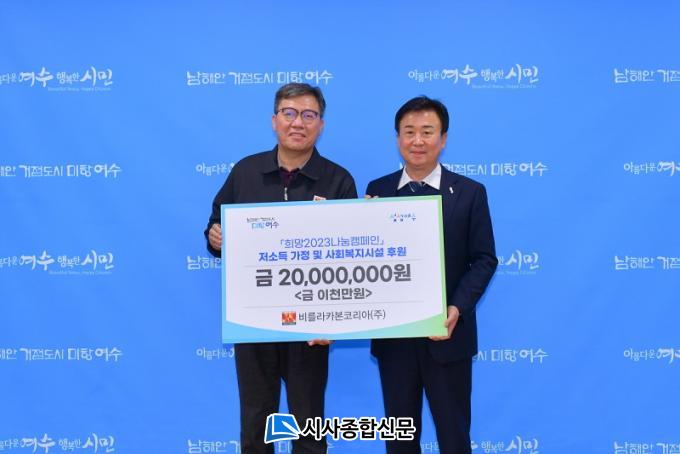| ¿©¼ö½Ã(½ÃÀå Á¤±â¸í)¿¡ µû¸£¸é 2009³âºÎÅÍ 15³â° ³ª´®À» ½ÇÃµÇØ¿Â ºñ¸¦¶óÄ«º»ÄÚ¸®¾Æ(ÁÖ)(°øÀåÀå ÀÓ¿õ´ë)°¡ ¿ÃÇØµµ °ü³» Àú¼Òµæ °¡±¸¿Í »çȸº¹½Ã½Ã¼³À» À§ÇÑ ¼º±Ý 2õ¸¸ ¿øÀ» ¿©¼ö½Ã¿¡ ±âŹÇß´Ù.